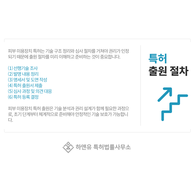 이처럼 피부 미용장치 특허 출원은 단순한 서류 제출이 아니라 기술 분석과 권리 설계가 함께 이루어지는 과정입니다.