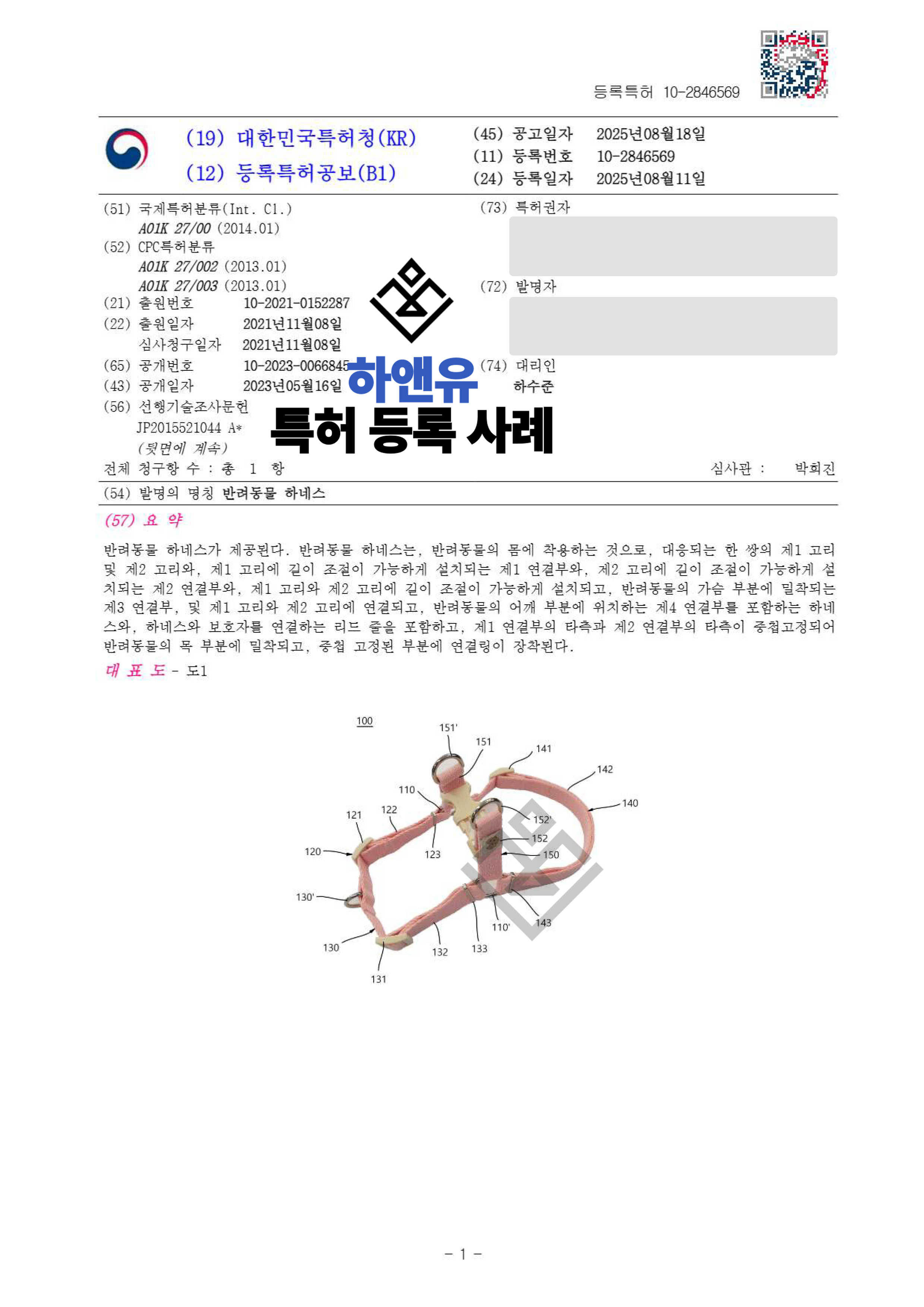 하앤유특허법률사무소에서 반려동물 하네스 특허를 성공적으로 등록하였습니다.