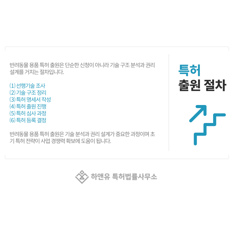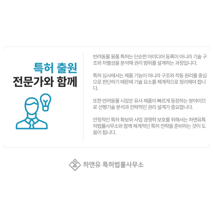 이처럼 반려동물 용품 특허 출원 절차는 단순한 서류 제출이 아니라 기술 분석과 권리 설계가 함께 이루어지는 과정입니다.