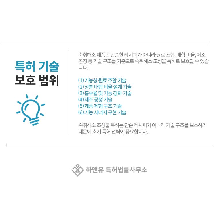 따라서 숙취해소 조성물 특허를 준비할 때는 어떤 기술 요소를 권리로 보호할 수 있는지 먼저 이해하는 것이 중요합니다.