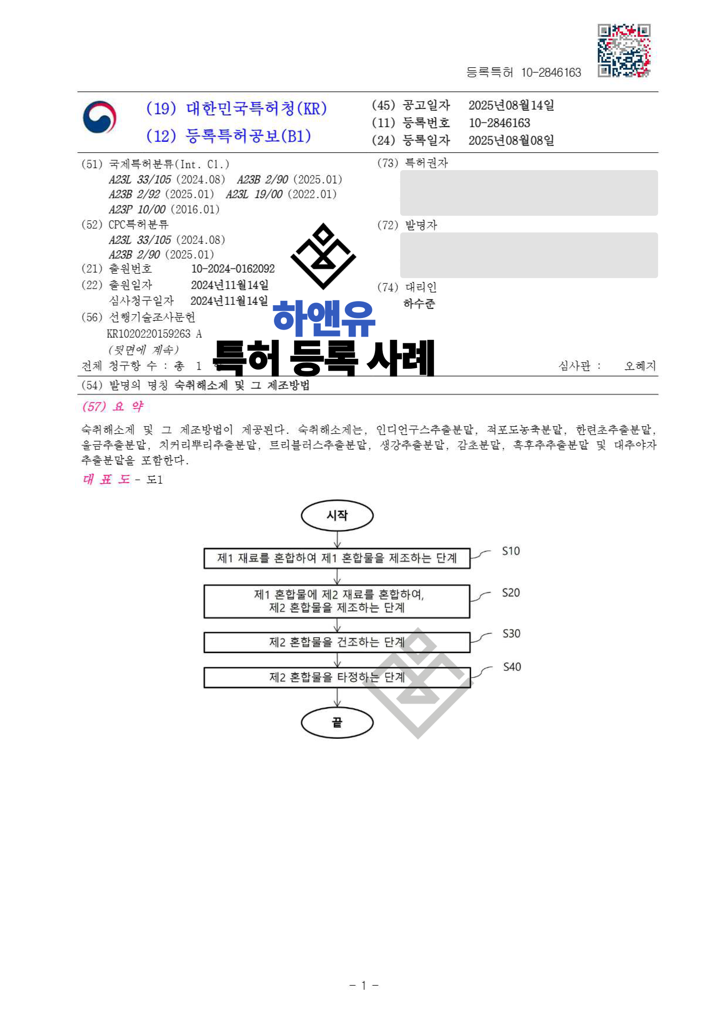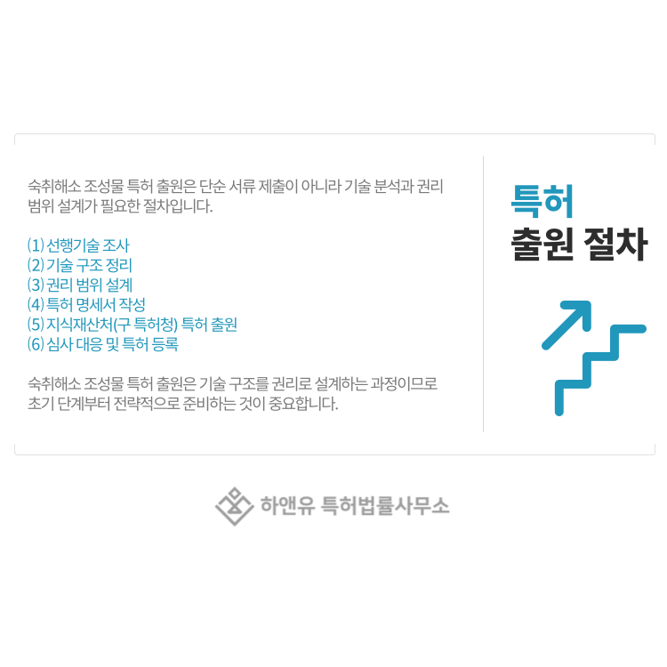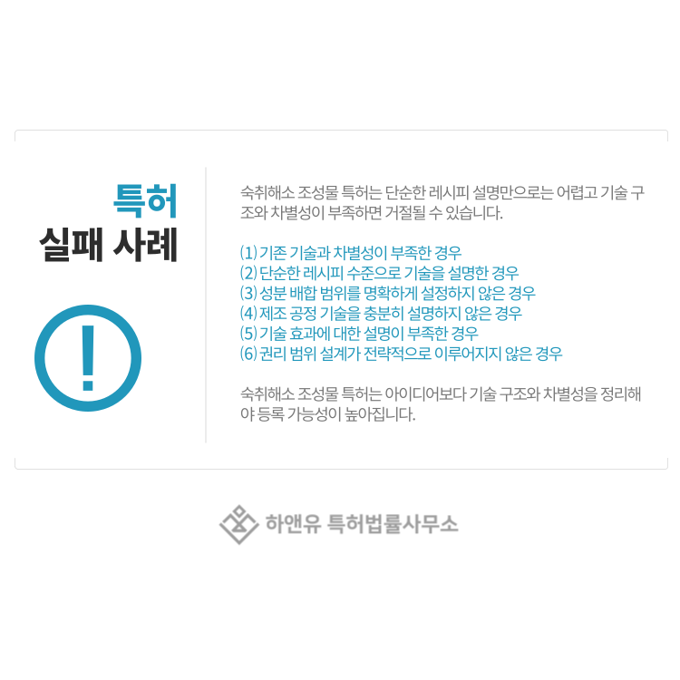 #숙취해소제특허 #숙취해소조성물특허 #기능성식품특허 #식품조성물특허 #숙취해소음료기술 #간보호성분기술 #알코올분해기술 #기능성음료특허 #식품특허출원 #특허출원 #특허등록 #특허권 #특허등록사례 #PatentRegistration #PatentApplication #특허사무소 #특허법률사무소 #하앤유특허법률사무소