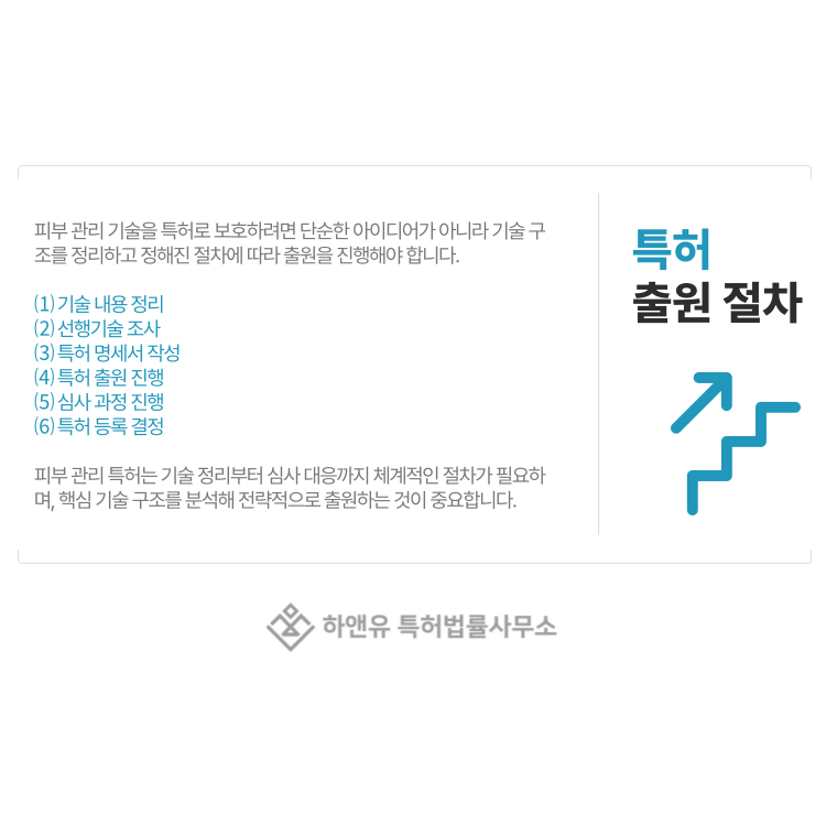 이처럼 피부 관리 특허 출원 절차는 기술 정리부터 심사 대응까지 여러 단계로 이루어집니다.