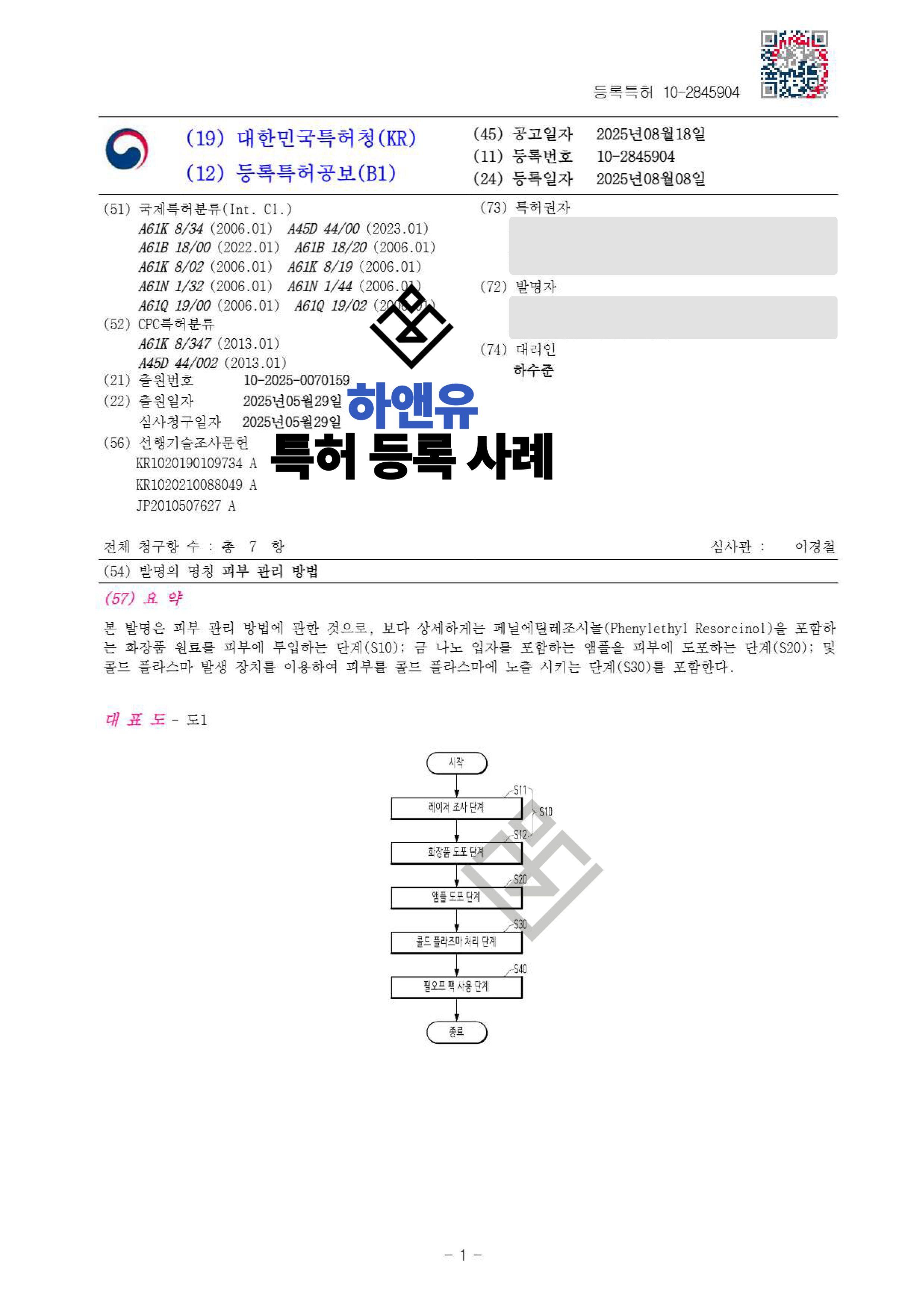 하앤유특허법률사무소에서 피부 관리 방법 특허를 성공적으로 등록하였습니다.
