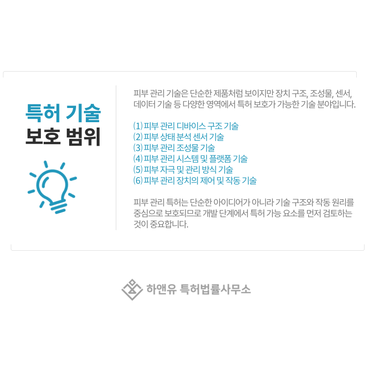하지만 실제로는 다양한 기술 요소가 결합된 분야이기 때문에 피부 관리 특허로 보호할 수 있는 범위도 생각보다 넓습니다.