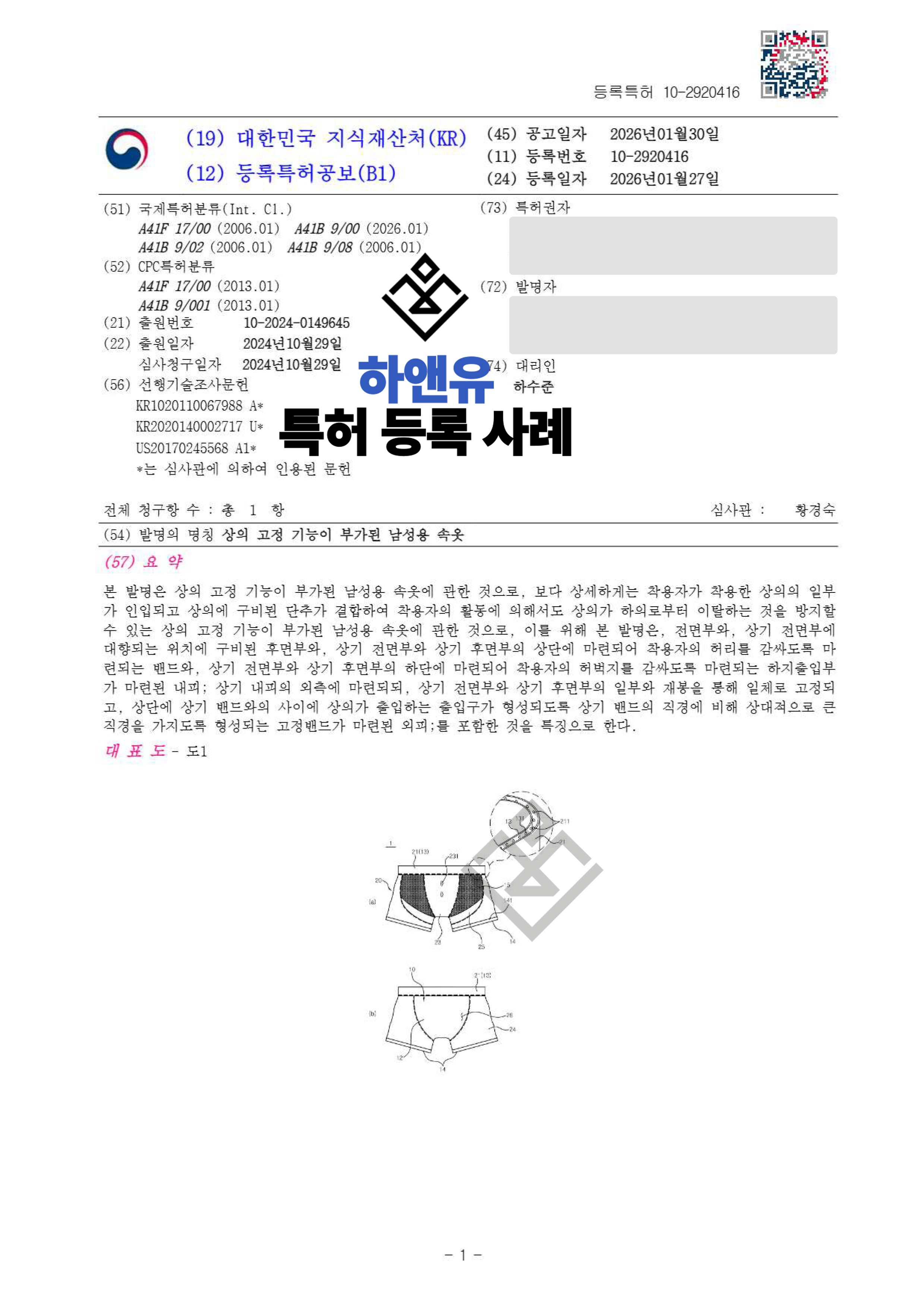 하앤유특허법률사무소에서 상의 고정 기능이 부가된 남성용 속옷 특허를 성공적으로 등록하였습니다.