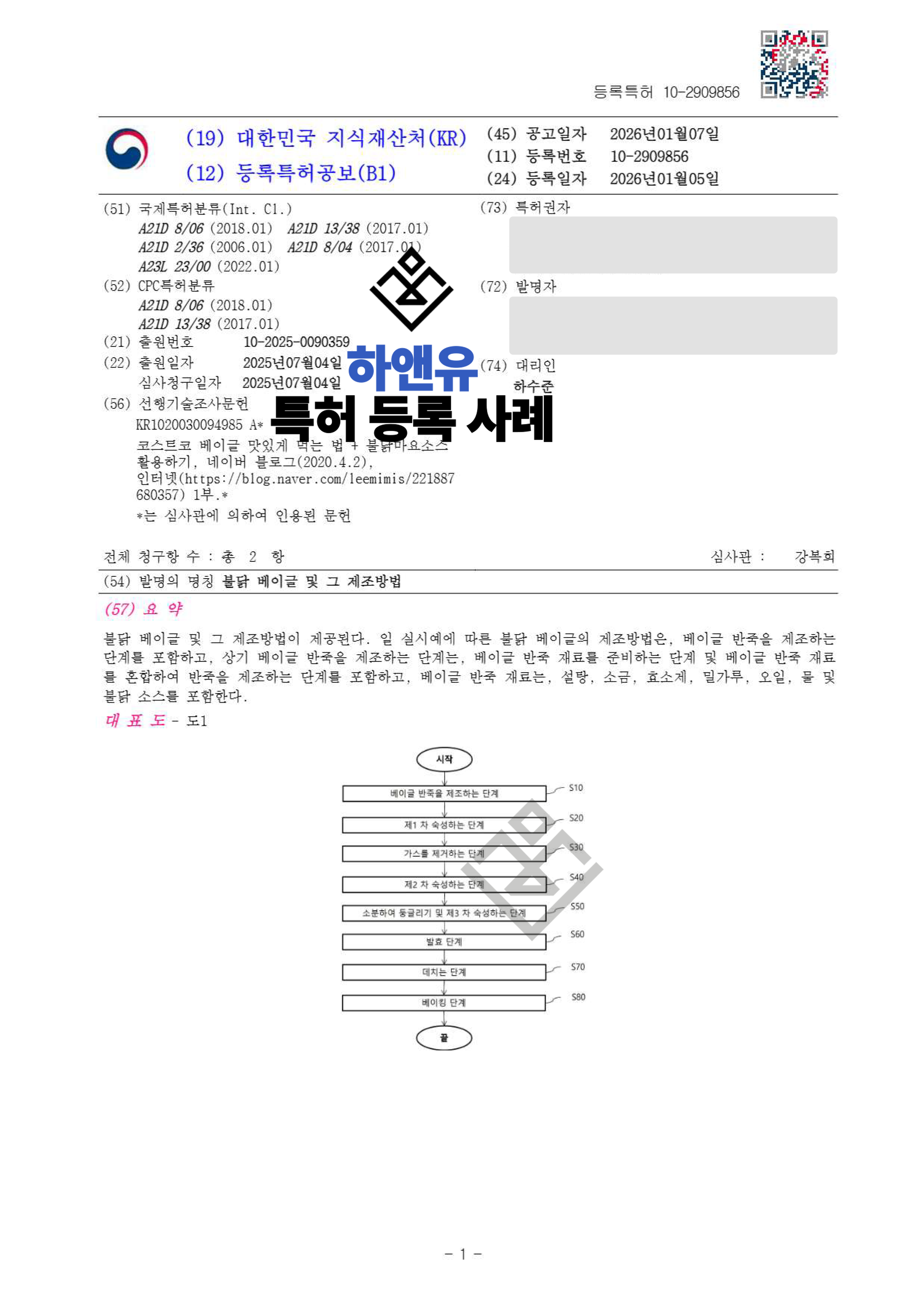 심사를 통과하면 가공식품 제조 특허로 등록됩니다.