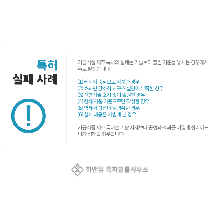 가공식품 제조 특허는 아이디어보다 정리 방식이 결과를 좌우하는 분야입니다.