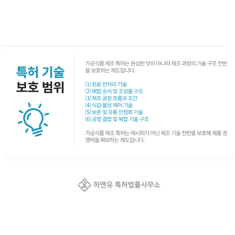 즉, 겉으로 보이는 레시피가 아니라 왜 그런 맛과 품질이 구현되는지를 기술적으로 설명해 권리로 만드는 것입니다.