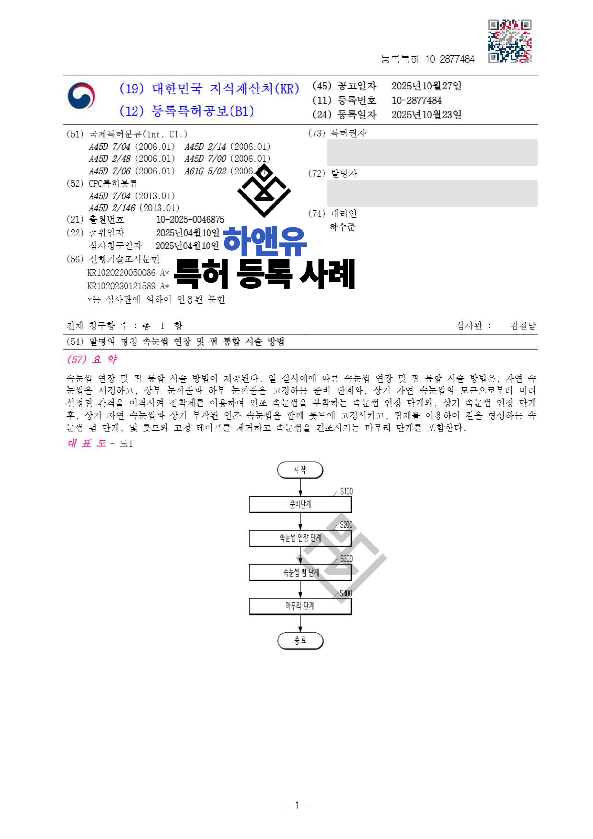 하앤유특허법률사무소에서 속눈썹 연장 및 펌 통합 시술 방법 특허를 성공적으로 등록하였습니다.
