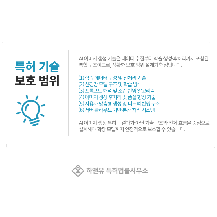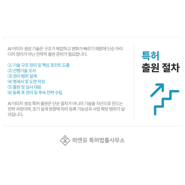 AI 이미지 생성 특허는 단일 요소가 아니라 기술 흐름 전체를 설계하는 과정입니다.