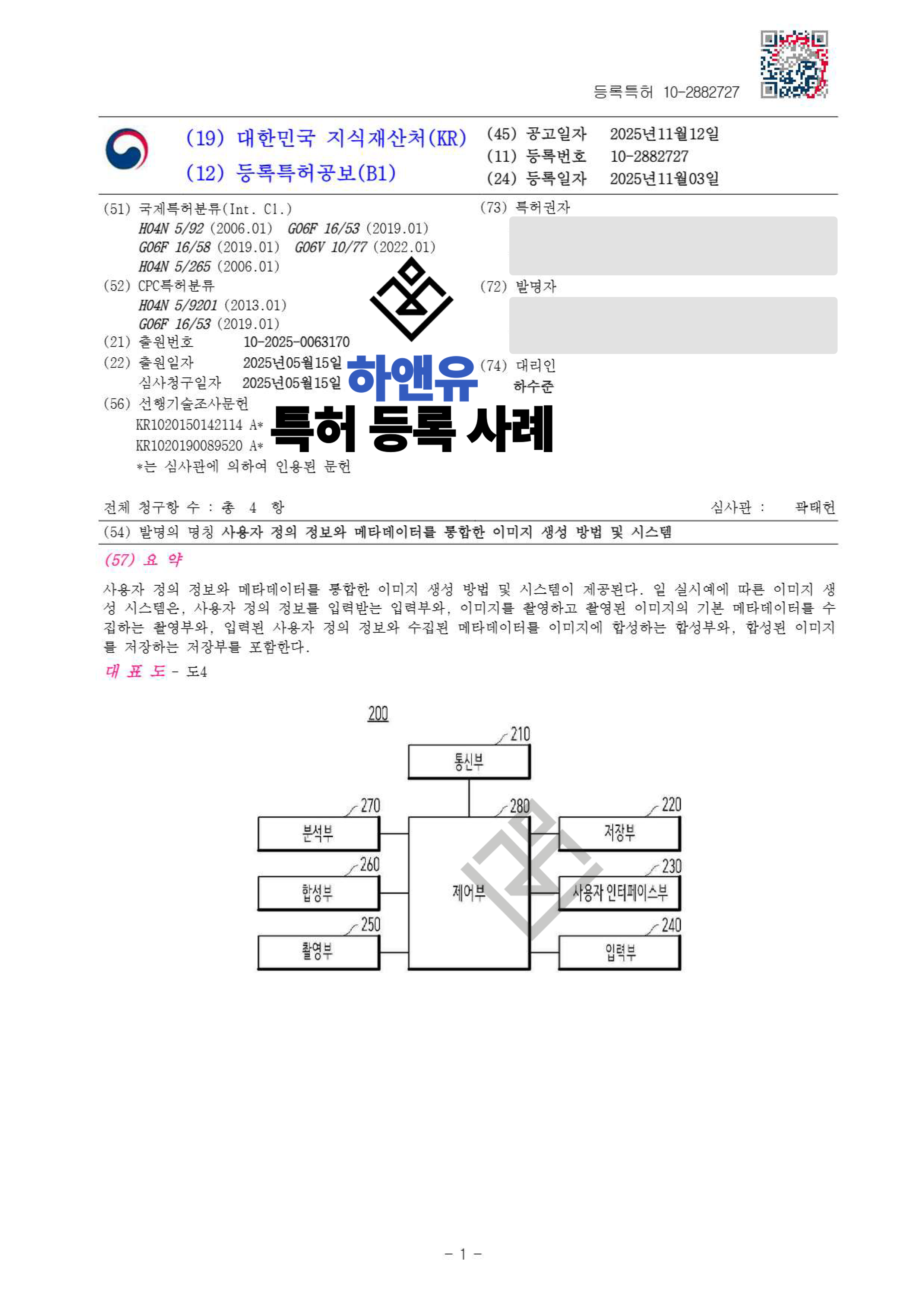 하앤유특허법률사무소에서 사용자 정의 정보와 메타데이터를 통합한 이미지 생성 방법 및 시스템 특허를 성공적으로 등록하였습니다.