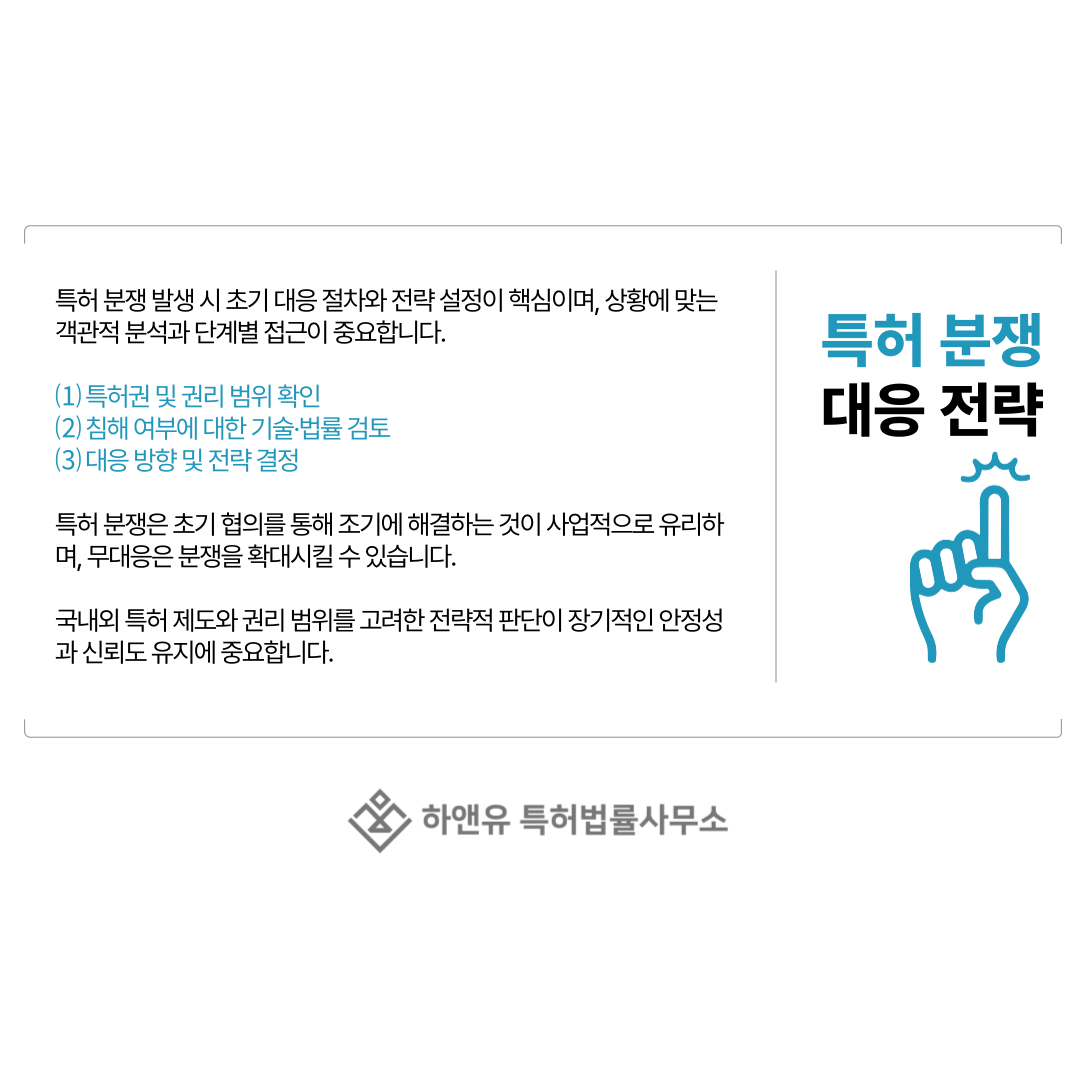 특허 분쟁 대응은 감정적인 판단이 아닌, 객관적인 권리 분석과 단계별 전략을 바탕으로 진행되어야 합니다.