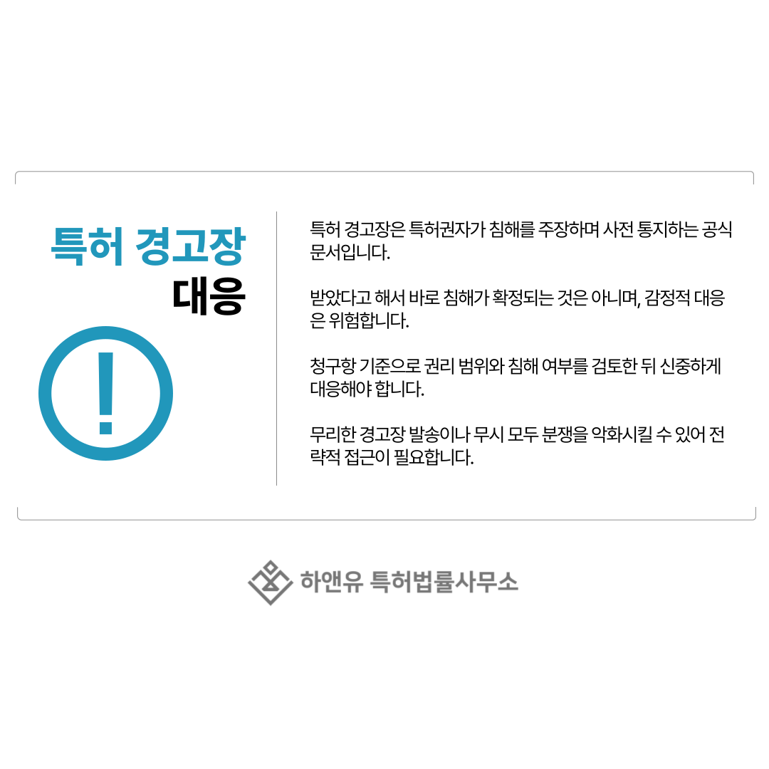 다만 특허 경고장은 분쟁의 출발점이 될 수 있기 때문에 가볍게 넘겨서는 안 되는 중요한 문서입니다.