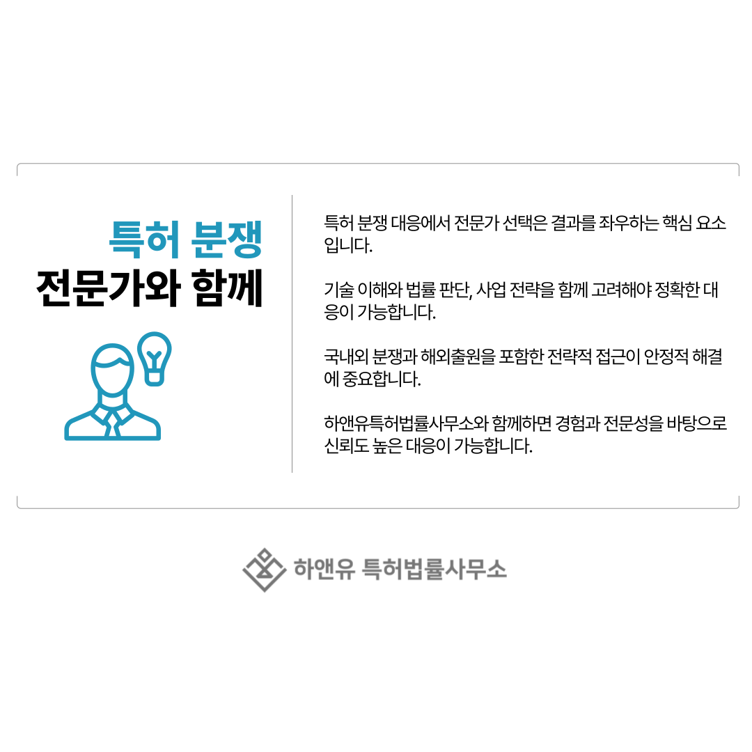 하앤유특허법률사무소와 함께라면 복잡한 특허 분쟁 상황에서도 보다 신뢰도 높고 전략적인 대응이 가능합니다.