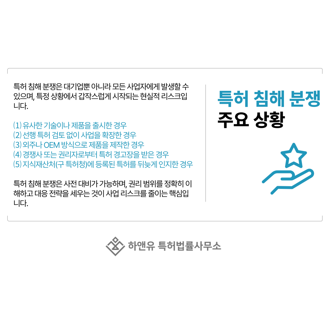 특허 분쟁은 주로 특허 경고장 수령, 침해 주장 통보, 협상 또는 소송 검토의 형태로 현실화됩니다.