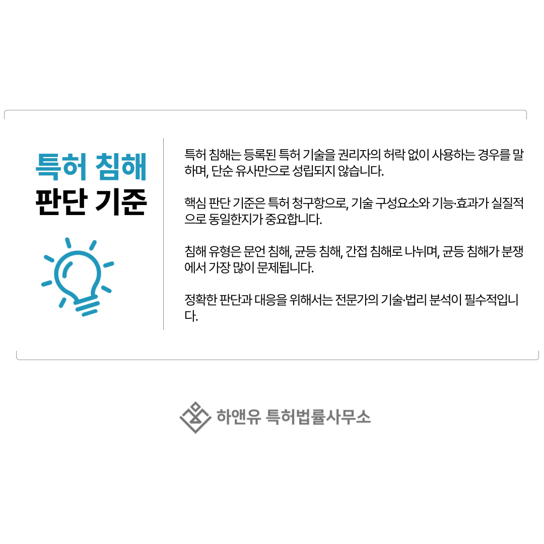 기술 구성 비교, 기능과 효과의 동일성, 균등 침해 여부 등 전문적인 법리와 기술 해석이 함께 필요하기 때문입니다.