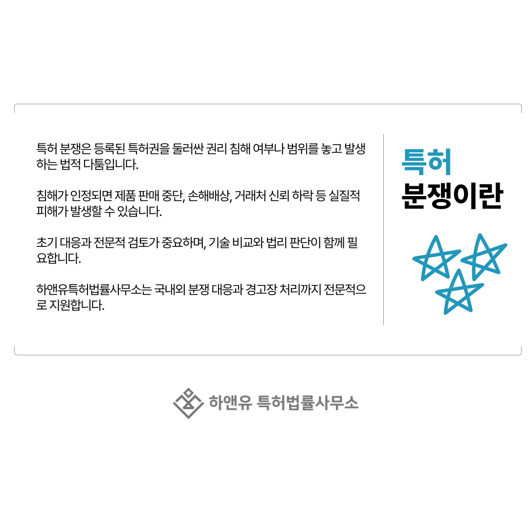 #특허분쟁 #특허침해 #특허경고장 #지식재산권 #특허소송 #특허분쟁대응 #침해대응 #경고장대응 #지식재산처 #특허전문 #특허출원 #특허등록 #특허권 #PatentRegistration #PatentApplication #특허사무소 #특허법률사무소 #하앤유특허법률사무소