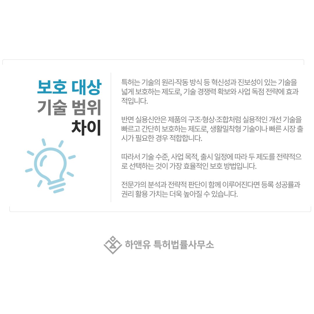 이 차이를 이해하면 기술 수준에 따라 어떤 제도로 출원해야 하는지 훨씬 명확해집니다.